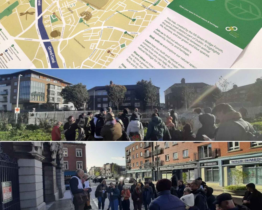 Since 2021, Common Ground supported and coordinated the D8 Green Bridge Forum as one its developmental areas of work. This included: monitoring encroachment of the north bank of the Grand Canal Tow Path and bringing it to the attention of Waterways Ireland and Dublin City Council; highlighting the development of local public social, biodiverse and cultural initiatives; supporting Turvey Park volunteers and its development as a local quality and biodiverse greenspace; responding to the Dublin City Development Plan; observations on the Emmet Road redevelopment; annual walks and talks during Heritage Week, Open House and Culture Date for Dublin 8. The forum’s membership created and produced the map -‘Bridging the Blue & Green’ – a resource that highlights the symbiotic relationships between animal life, humans, across Dublin 8’s local green and blue corridors and its landmark sights. The Forum also hosted specialist talks at IMMA outdoors with UCD Professor Gerald Mills (2021) and Lorraine Bull, Biodiversity officer Fingal County Council on creating biodiverse corridors (2024).