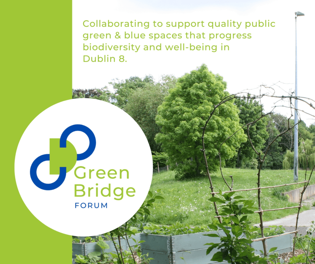 The D8 Green Bridge forum is an active voluntary group that values and supports the access to and development of quality public green and blue spaces, in order to progress connectivity and community well-being across the Dublin 8 area. The wider membership of the group reaches across the Dublin 8 area and includes local residents, representatives of Turvey Park volunteers, Trees for Tenters, the Inchicore Environment Group and Donore Area Sustainable Community and FUNAFLOAT.